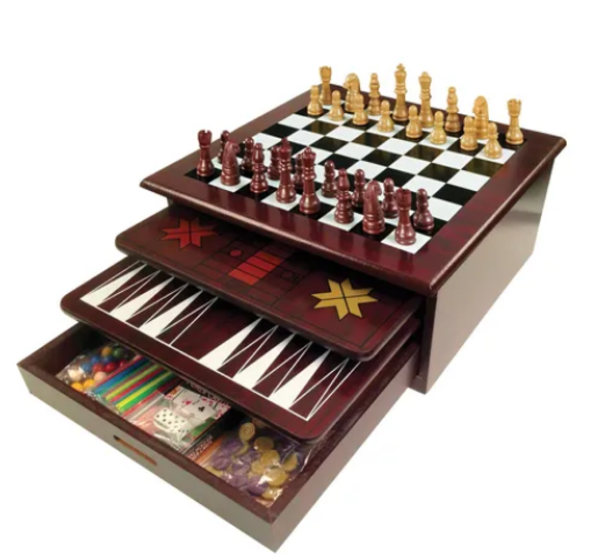 Todos los clásicos reunidos en un solo Set. Centro de Juegos de Madera 12 en 1; la diversión nunca tendrá fin con este completo set de 12 juegos clásicos en 1 sola caja de madera. Con este set podrás disfrutar de tus juegos favoritos de todos los tiempos como Ajedrez, Damas, Pachisi, Backgammon, Palillos, Cartas, Damas Chinas, Mancala, Dados, Serpientes y Escaleras, Solitario y Gato. Los clásicos juegos de mesa están aquí.