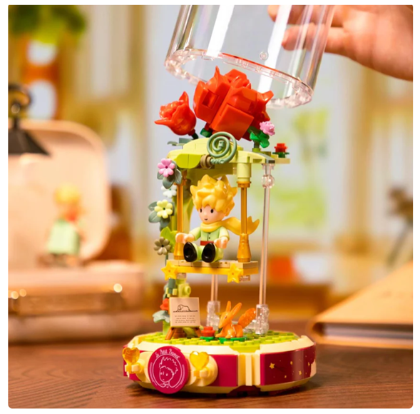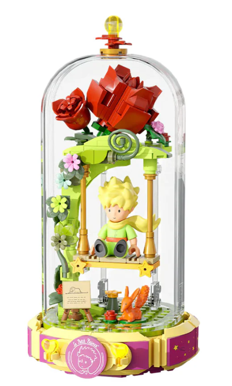 Bajo la delicada cúpula transparente, el Principito descansa en un columpio, acompañado por su inseparable zorro y rodeado de un jardín encantado. Sobre él florece su amada rosa, símbolo eterno del amor, el cuidado y la responsabilidad que marcan su historia. Cada detalle de esta escena evoca ternura: las flores que adornan la estructura, la calma del columpio y la mirada serena del Principito, que recuerda la importancia de los lazos que creamos en la vida.