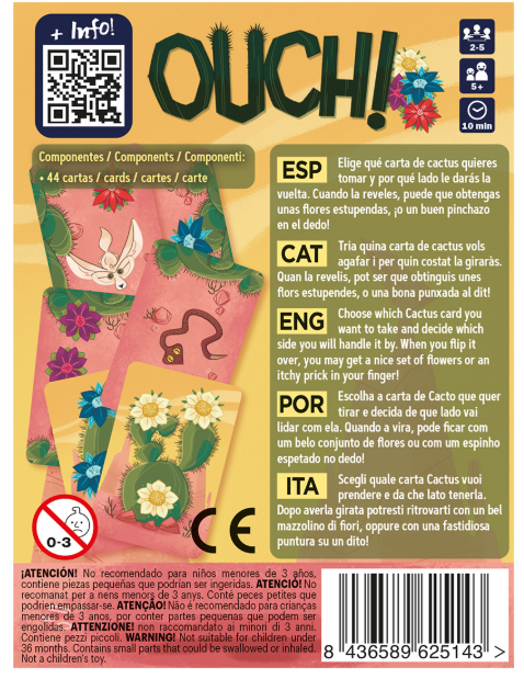 ¡Ouch! Es un juego de cartas creado por Romain Caterdjian y Théo Rivière e ilustrado por Fran Collado. Recomendado a partir de cinco años, pueden participar de 2 a 5 jugadores en partidas de unos diez minutos de duración. Los jugadores competirán por obtener el mayor número y más variedad de flores de cactus, evitando los pinchos afilados.